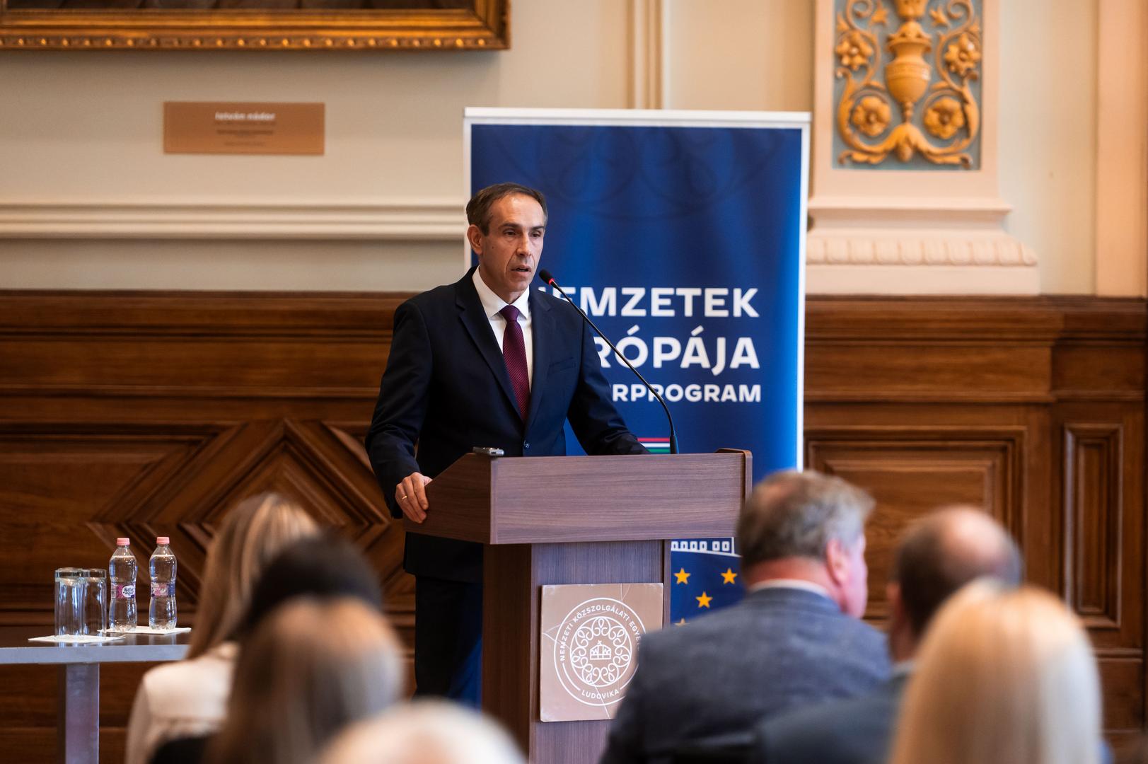 Szegedi László, az NKE oktatási rektorhelyettese beszédében kiemelte: az egyetemnek kiemelt feladata, hogy bázisintézményként biztosítsa az európai uniós intézmények működésének megismerését. Az ÁNTK ennek megfelelően a hazai és nemzetközi közigazgatási szakemberek képzésének központja, ahol többek között külön Európa-tanulmányok Tanszék és Jean Monnet Chair is működik. Szegedi László kitért arra is, hogy az egyetem az elmúlt években aktívan részt vállalt a 2024-es magyar EU-elnökség stábjának felkészítésében, amelyet számos, a programban végzett hallgató erősített. Kiemelte: a képzés nemcsak szakmai tudást ad, hanem hozzájárul a nemzetközi szellemi párbeszédhez és az Európa jövőjét érintő aktuális kérdések megvitatásához. A rektorhelyettes beszédében hangsúlyozta: napjainkban a versenyképesség kérdése egyre inkább előtérbe kerül, miközben a szolidaritás fontossága sem kerülhető meg.