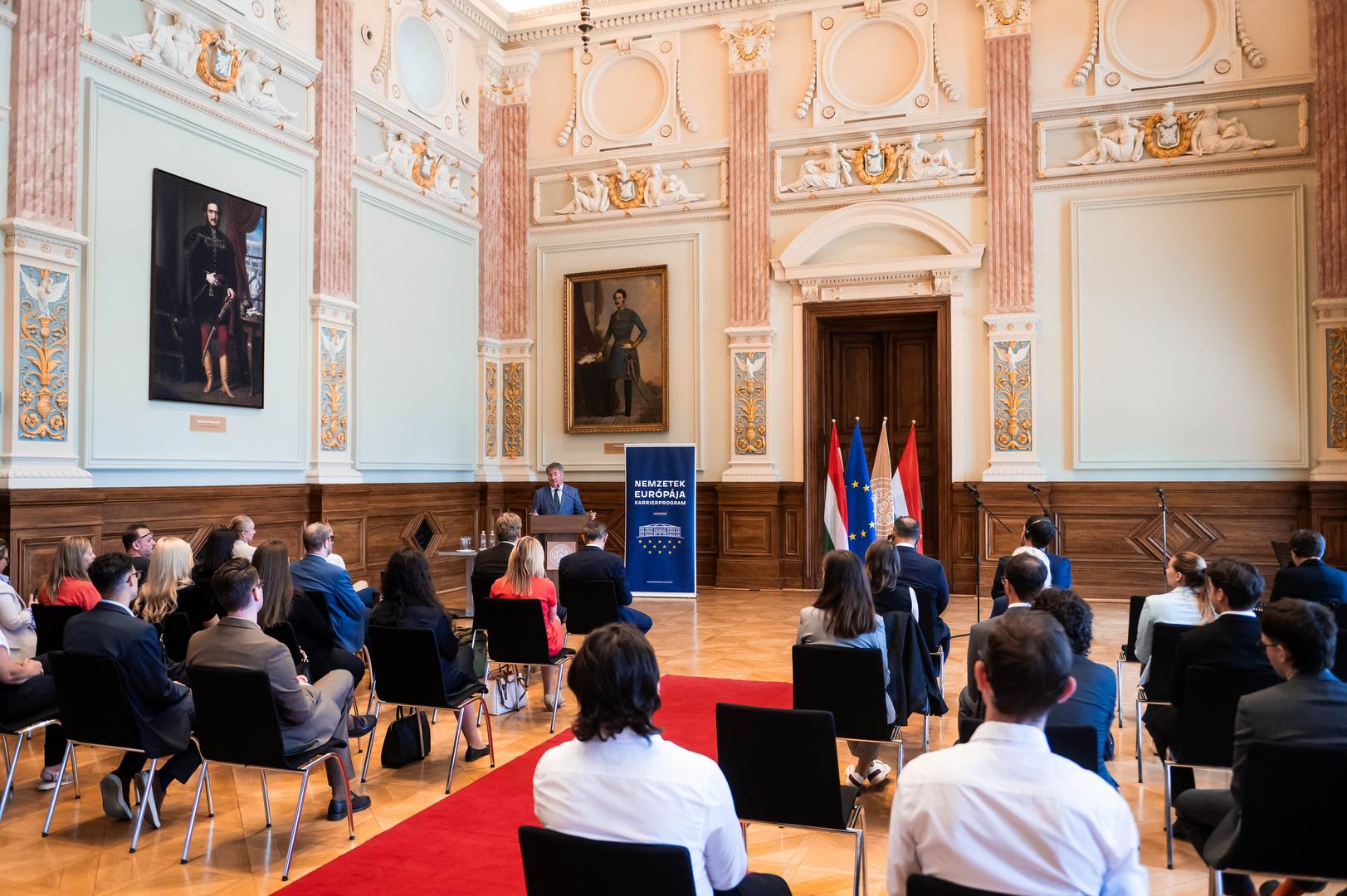 Immár hatodik alkalommal nyitotta meg kapuit a Nemzetek Európája Karrierprogram. Az ünnepélyes tanévnyitó szeptember 15-én zajlott a Nemzeti Közszolgálati Egyetem (NKE) Széchenyi Dísztermében, az Államtudományi és Nemzetközi Tanulmányok Kar (ÁNTK) szervezésében. A 2020-ban indult program – amely az egyetem és az Európai Uniós Ügyek Minisztériuma (EÜM) együttműködésében valósul meg – célja, hogy Magyarország több, az európai uniós intézményeknél elhelyezkedő szakemberrel rendelkezzen. E mellett kiemelten fontos Magyarország hatékonyabb uniós érdekérvényesítésének erősítése és olyan szakemberek képzése, akik rendelkeznek a magyar közigazgatáson belül is szükséges és hasznosítható intézményi, jogi és nyelvi ismeretanyaggal.