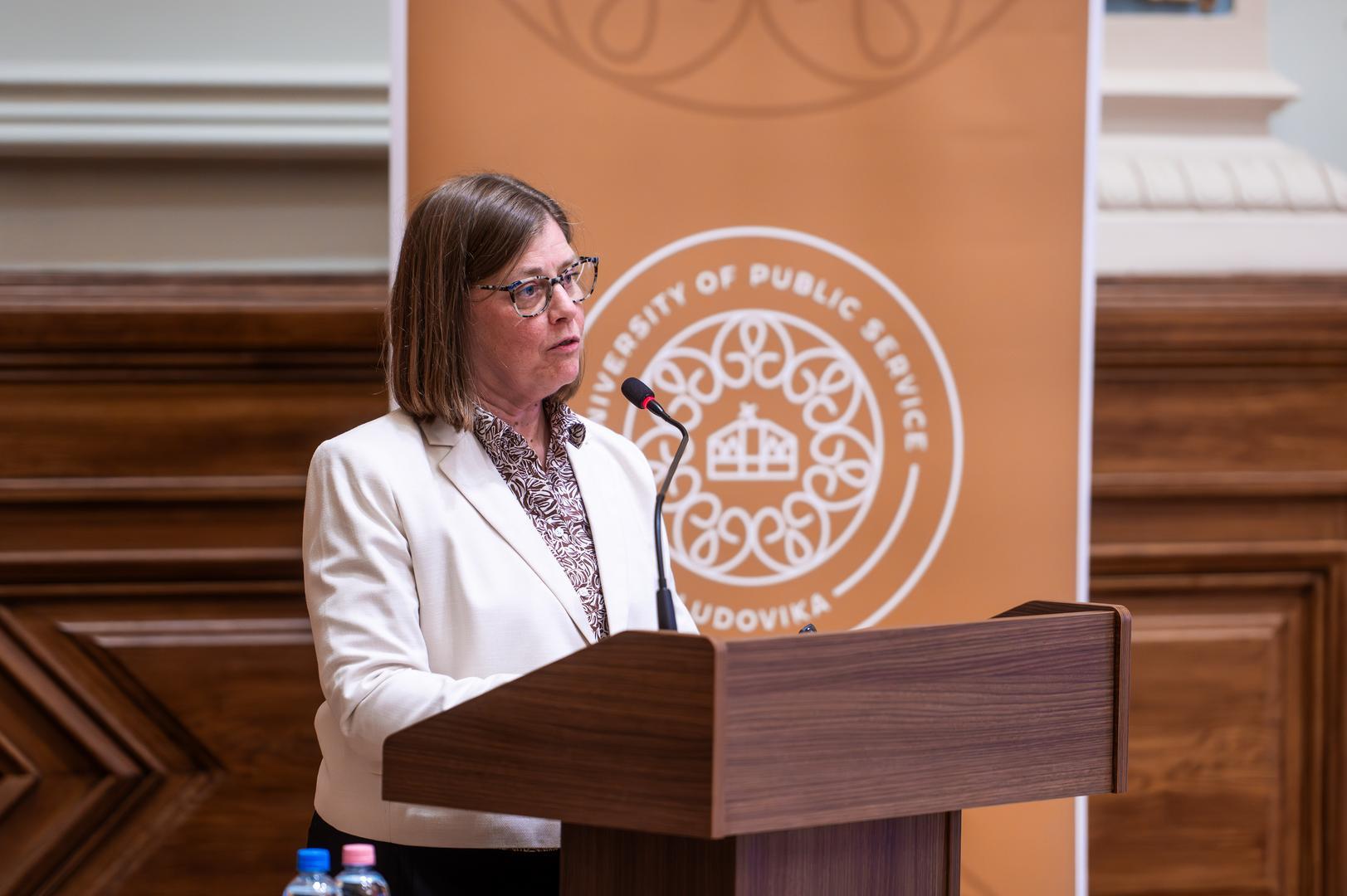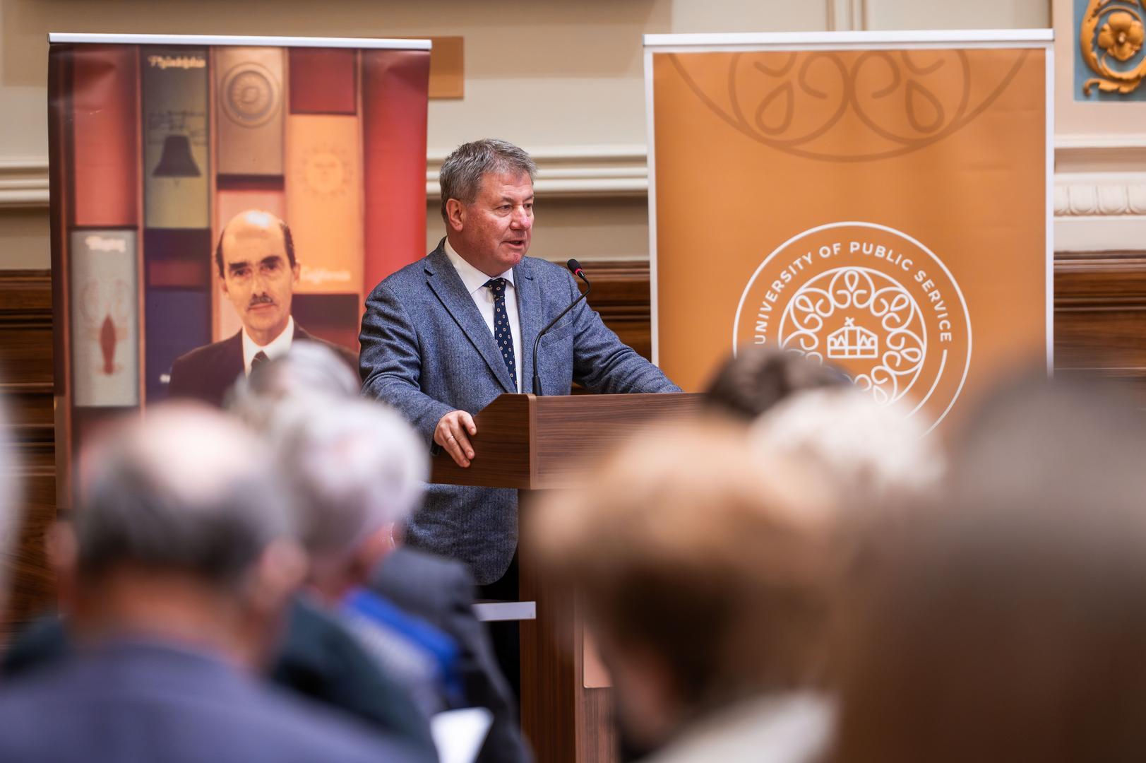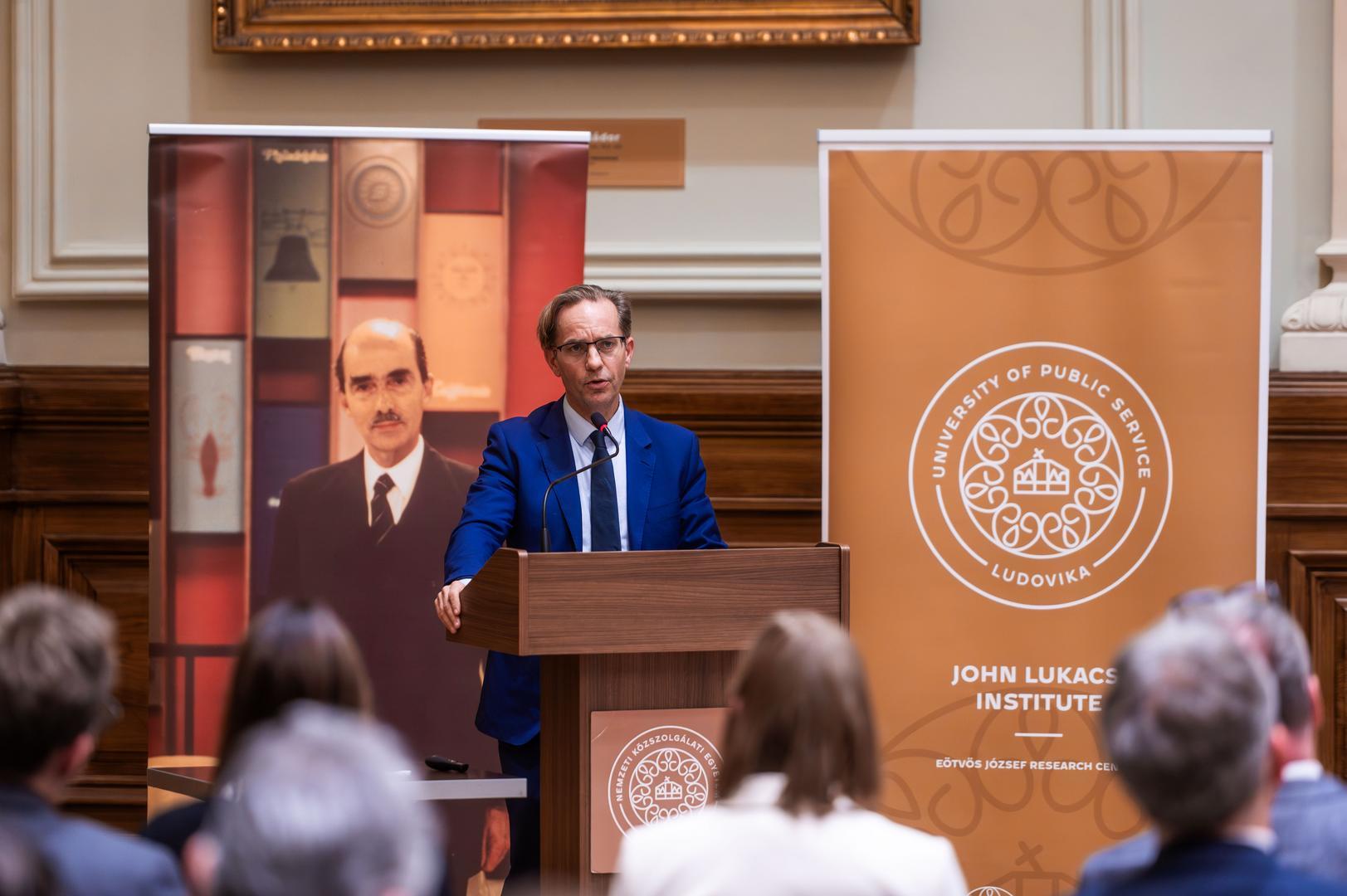 Deli Gergely, az NKE rektora köszöntőjében kiemelte, a jelen konferencia újabb lehetőséget teremtett arra, hogy közösen áttekintsék a világhírű történész szellemi örökségét, valamint magyar és amerikai identitásának jelentőségét. Hangsúlyozta, hogy munkássága és gondolkodása különösen fontos az NKE számára, amely tudatosan ápolja John Lukacs szellemi örökségét: egyebek mellett 2021 decemberében nyílt meg az egyetem Szárnyépületében a John Lukacs Társalgó, ahol a történész személyes tárgyai, könyvei és kéziratainak egy része is megtekinthető. Ezt követően 2022-ben konferenciát rendeztek John Lukacs és az amerikai konzervativizmus címmel, majd 2024 januárjában a Szellem és jellem című tanácskozáson emlékeztek meg születésének századik évfordulójáról. Ezzel párhuzamosan az egyetemen megalakult a John Lukacs Intézet, amelynek egyik fő célja Lukacs szellemi hagyatékának gondozása és továbbadása. Deli Gergely emlékeztetett, hogy John Lukacs 1944-ben, fiatalon hagyta el Magyarországot családjával együtt, ám identitásában mindvégig megmaradt magyarnak. Ezt fejezi ki az a gondolat is, amely az idei rendezvény mottójává vált. Hangsúlyozta, hogy történetírói szemlélete új hangsúlyokat hozott a 20. századi historiográfiába: az egyén, a személyiség és a mentalitás szerepét állította a történelmi elemzés középpontjába, hidat képezve Európa és Amerika gondolkodása között, és történetírása ma is iránymutató.
