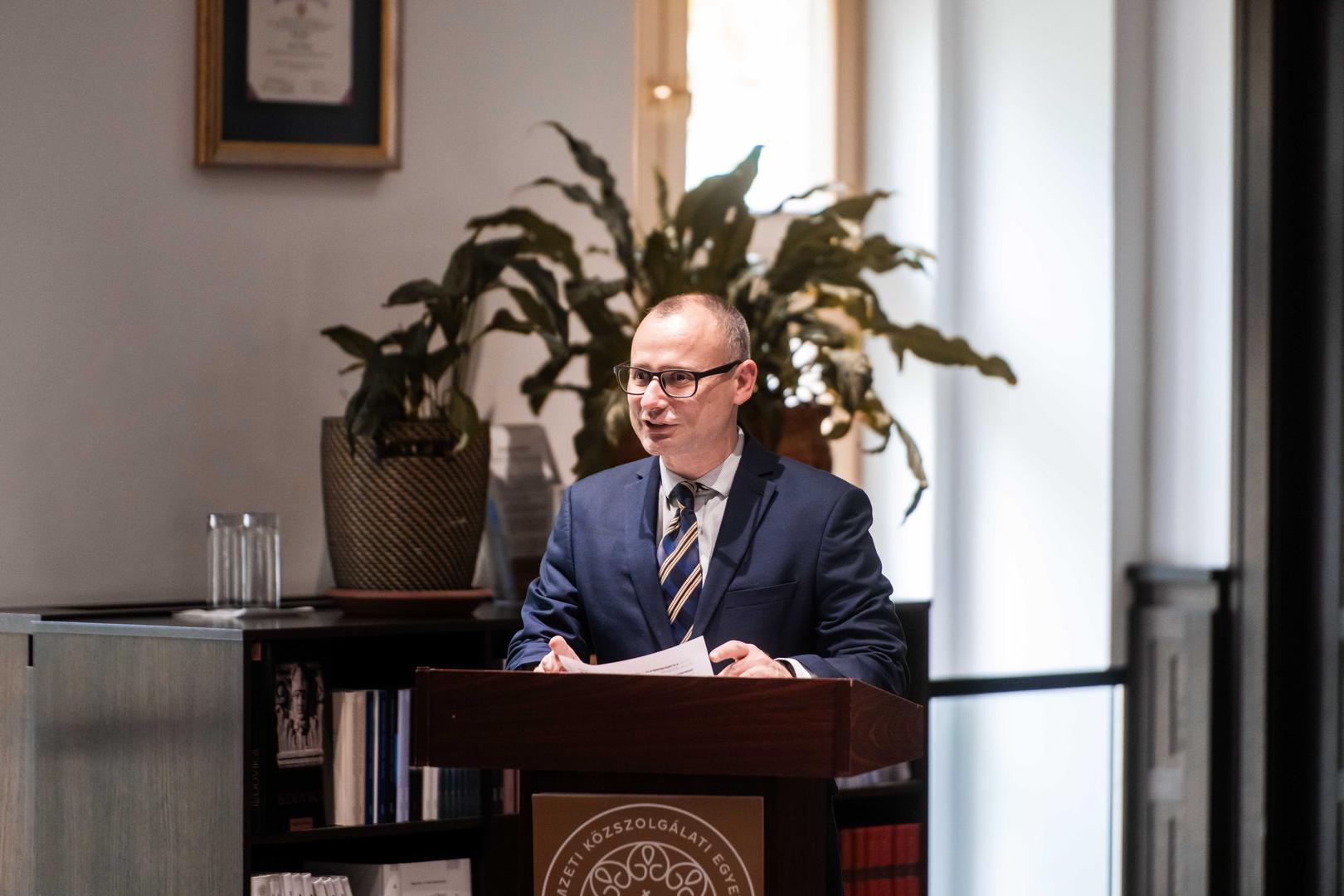 Újházi Lóránd, az NKE EJKK Vallás és Társadalom Kutatóintézet vezetője köszöntőjében hangsúlyozta, hogy a bemutatott kötet a magyarországi holokausztkutatás és az embermentési kísérletek egyik kiemelkedő munkája. A mű különlegessége abban rejlik, hogy egy olyan naplóra épül, amely szinte percről percre követhetővé teszi az eseményeket, és egyszerre tárja fel az ellenállás, a diplomáciai mentőakciók működését, valamint a korszak súlyos bűneit és elkerülhetetlen felelősségét. „A napló egy egyéni sors lenyomata, valamint az ellenállás és a mentőakciók belső mechanizmusának tükre” – fogalmazott az intézetvezető. Hangsúlyozta, hogy az intézet – amelynek munkájához szorosan kapcsolódik ez a kötet – 15 évvel ezelőtt kezdte meg működését, és azóta több mint 200 publikációval járult hozzá a tudományos diskurzushoz. Kutatásaik kiterjednek a vallási üldözések különböző aspektusaira – például afrikai keresztény közösségekre –, és jelentős nemzetközi együttműködéseket építettek ki. Kiemelte azt is, hogy a Vallás és Társadalom Kutatóintézet munkájában egyszerre jelenik meg a magas szintű tudományos tevékenység és a társadalmi felelősségvállalás, valamint az érzékenyítés szándéka. Hozzátette: a bemutatott kötet ehhez hozzájárul, hiszen nemcsak a múlt megértését segíti, hanem a jelen erkölcsi kérdéseire is reflektál.
